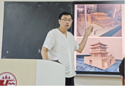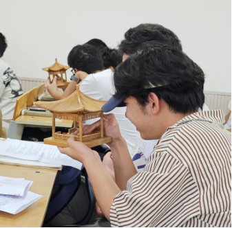 张欣老师以古建筑微缩技艺为核心,揭秘了古建筑微缩中蕴含的营造法式;张钦老师则通过矿物颜料与沥粉工艺结合的古法沥粉技艺讲述,展现传统绘画的立体美学。师生通过近距离观察、互动体验,直观感受非遗工艺的“指尖魅力”。本次活动打破传统课堂边界,通过“非遗传承人进高校”的形式,不仅深化了学习者对传统民俗工艺的具象认知,又深切体悟非遗背后的工匠精神和中华优秀文化根脉。