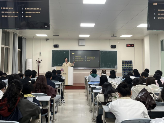 副院长马雪莲主持,特邀国际交流与合作处(国际教育学院)梁茵老师、韩烨老师和贠子璇老师主讲,为同学们介绍出国学习的项目、政策、规划等相关事宜。