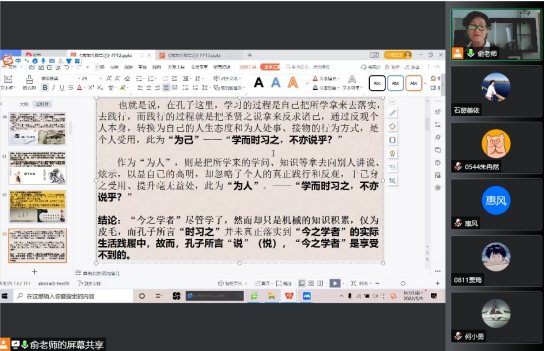 俞秀玲老师当天的课堂主题是孔子《论语》经典解读。俞老师借用“君子有九思”、“有君子之道四焉:其行己也恭,其事上也敬,其养民也惠,其使民也义”、“学而时习之,不亦说乎”、“士而怀居,不足以为士矣”等名言名句解释经典文本,为我们描述了理想中的读书人应该具有安贫乐道的美好品格,同时要有责任担当和大局意识,投身到祖国的建设中去。