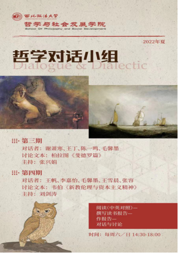 哲学对话小组成立于2021年5月15日,张兴娟老师负责,2021年已举办两期;本学期开始举办第三、四期,第四期由刘剑涛老师主持,主题为韦伯的《新教伦理与资本主义精神》,近期即将开始。