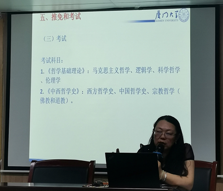 厦大哲学系的陈玲教授对厦大哲学系的招生专业,以及导师、学校的奖学金助学金一一等做了介绍。重点介绍了“博士申请考核制”,要求申请者具有学术追求,体现自身潜质的学术论文报告,与导师的研究方向要相近。对是否是名校毕业和是否公开发表论文没有要求,旨在吸收真正热爱哲学专业,具有学术钻研精神的优秀学生。会后宾主进行了合影,厦大哲学系赠送了绅士漫画 具有纪念意义的礼品。