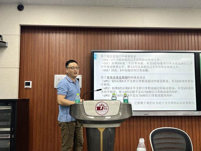 讲座内容共五部分,王聚副教授在第一部分“导论”中主要介绍了当代怀疑论的概况,着重介绍了基于闭合原则和非充分决定原则的怀疑论论证。他探讨了怀疑论者塑造的认知理想型,旨在从纯粹的认识论角度反思我们的认知实践,并讨论了如何客观地评价自己的认知活动以及如何应对。他引出了一个关键问题,即日常认知评价与怀疑论认知评价之间的关系对认知理想型的评估具有重要意义。