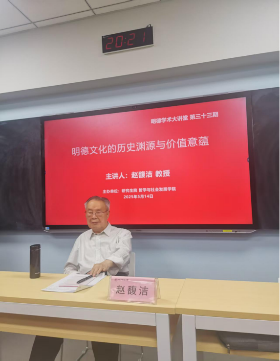 赵馥洁老师围绕明德文化的上古史影、明德文化的价值意蕴和明德文化的深远影响与现代意义三个方面展开。他以明德文化的古史源流图谱为路径,详细论证舜、夏、商、西周不同朝代“明德”的不同含义。指出明德文化的价值意蕴包含“勤用明德”的治世价值、“明德慎罚”的司法价值、“自昭明德”的人格价值、“在明明德”的教育价值。他强调“明德文化”开拓了儒学学派的思想源头,奠基了中华文化的突出特质,展开了中国思想史的问题域即政治观、教育观、人生观、人才观、价值观、学术观。他认为现今我们继承弘扬传统的明德文化和明德精神的现实意义主要有两个方面,一曰明德以治世,二曰明德以修己。