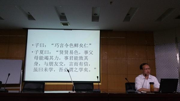 晚上7点钟讲座开始,张教授以狄更斯《双城记》中“这是一个最好的时代,这是一个最坏的时代;这是一个智慧的年代,这是一个愚昧的年代;这是一个光明的季节,这是一个黑暗的季节……”作为引子开始了本次讲座。他用《论语》中两句话来表明他对中国传统哲学中关于人生智慧的态度。第一句,子曰,“巧言令色鲜矣仁。”第二句,子夏曰“贤贤易色;事父母,能竭其力;事君,能致其身;与朋友交,言而有信。虽曰未学,吾必谓之学矣。”并指出,“竭其力”是伦理关系中孝道的根本,“致其身”是交互主体间的换位思考,而“言而有信”则是契约至上精神的体现。而中国传统哲学的精髓正是在于先哲们对于人之道德、伦理的深刻把握。