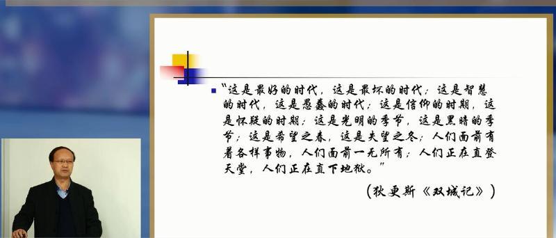 讲座伊始,张教授以狄更斯《双城记》中“这是一个最好的时代,这是一个最坏的时代;这是一个智慧的年代,这是一个愚昧的年代;这是一个光明的季节,这是一个黑暗的季节……”作为引子,形象地向我们揭示了现代文明的优缺,揭示了我们的现代制度并不能替我们解决所有的社会问题,在现代化的进程中有必要结合我们中国新儒学的思想,以中西结合的视角理性地看待我们现代化进程中产生的问题。