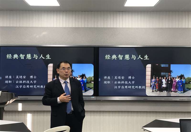 在5号教学楼407智慧教室举办了题为“经典智慧与人生”的学术讲座。此次讲座由台湾云林科技大学汉学应用研究所吴进安教授主讲,绅士漫画