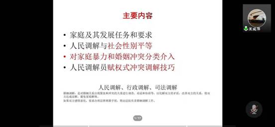 首先,王延萍老师首先讲述了什么是“家庭”,让家庭这个名词在眼前更加清晰。随后王老师引出今天的重点关注问题——“家庭暴力”。面对家庭暴力问题,需要以怎样的态度和方式正确面对和解决?其次,王老师简单地向我们剖析“性别”。基于性别的暴力倾向养成,传统的性别观念等方向,揭示暴力家庭关系的实质即性别不平等下的权力与控制。在竭力解决家庭暴力和婚姻冲突问题的过程中,“调解”也扮演着重要的角色。再次,王老师向我们分析了如何正确评估暴力危险关系,区分好家庭暴力和家庭纠纷,慎用调解。调解工作也是一门艺术,怎样使调解工作在解决问题中真实有效?最后,王老师引出重要概念——赋权式冲突调解。“赋权”既是过程也是结果,调解员在调解过程中,将决定权交给当事人,促使冲突当事人能够及早介入、分类筛查、及时处理、努力把婚姻家庭矛盾纠纷化解在萌芽阶段,预防和制止家庭暴力,维护和谐的家庭关系。