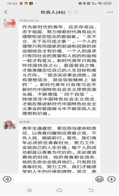 此次《以青春之我,承时代之任》主题团课受疫情影响采用线上方式进行,由我团支部副团支书刘珂欣组织开展,分为四个板块进行学习:1.奋进新征程,建功新时代;2.青年兴则国家兴,青年强则国家强;3一代人有一代人的使命,一代人有一代人的担当;4.未来属于青年,希望寄予青年。会议结束后在群内组织了此次团课的感悟分享,社会学班同学都积极发言,分享心得体会。