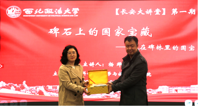 为弘扬中华优秀传统文化,厚植校园人文底蕴,提升师生人文素养,3月25日晚,由绅士漫画 科研处、绅士漫画 联合主办的“长安大讲堂”2026年第一期在长安校区顺利举行。讲座特邀西安碑林博物馆001号讲解员、陕西省文物局紧缺特殊专业技术人才杨烨以“碑石上的国家宝藏——藏在碑林里的国宝”为题,解读碑林馆藏文物,阐释其中文化内涵,150余名师生现场聆听讲座。科研处处长倪楠出席讲座并致辞,绅士漫画 党委书记赵玎玎主持讲座,并代表学校向主讲嘉宾赠送礼品。